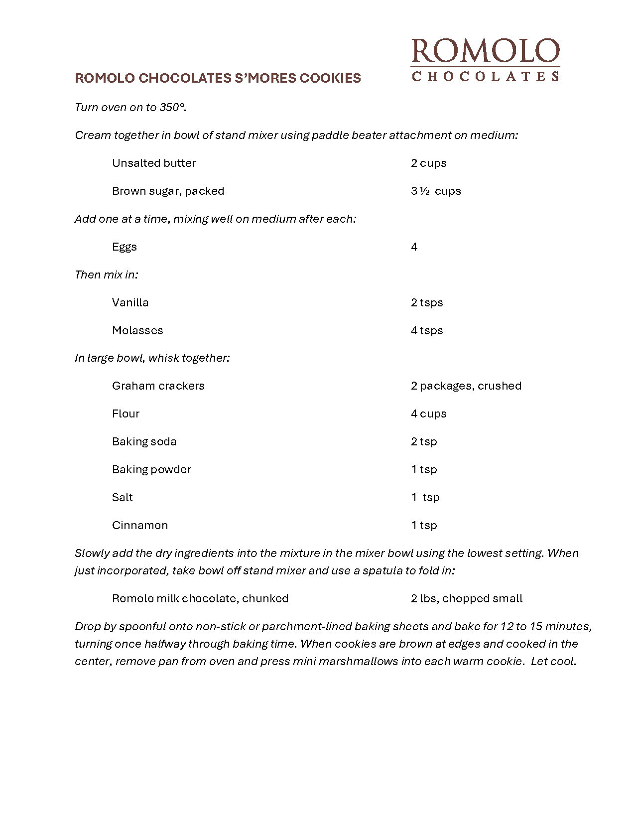 Our S’mores cookie is ready to make at home, featuring crushed graham crackers and Romolo milk chocolate chunks in the dough, topped with melted marshmallows — mmmm.